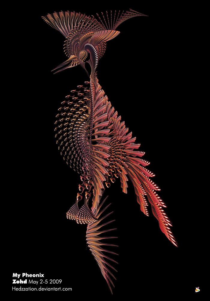chrome objects repeated in various ways, to create a full resolution phoenix at 100cmx70cm 300DPI size